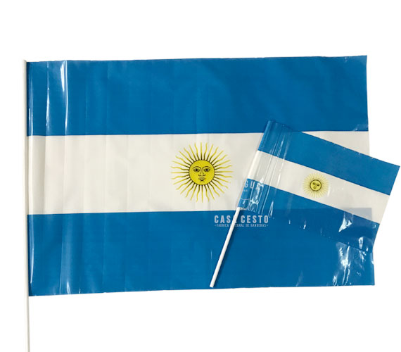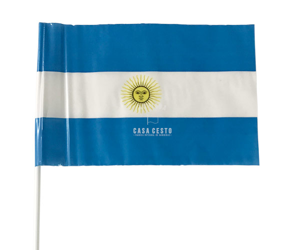Banderas Argentinas de Mano Plásticas. Realizadas en polietileno de 50 micrones. Van adhesivadas a la varilla mediante un pegamento inviolable para que el agite constante en la mano no produzca su desprendimiento.