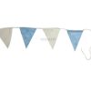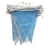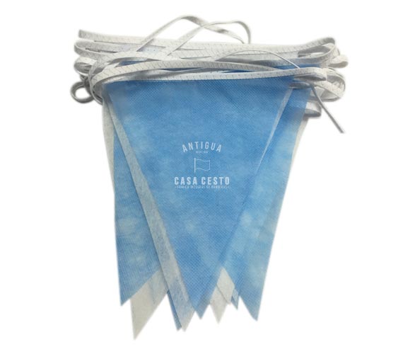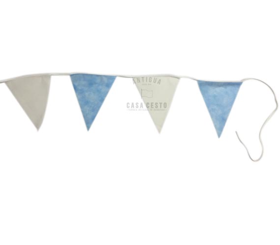 Guirnalda Argentina con Banderines en Tela Friselina Triangulares por 10 mts.  Banderines celestes y blancos alternados de 19 x 24 cm. colocados con costura reforzada zig zag con cinta al bies.