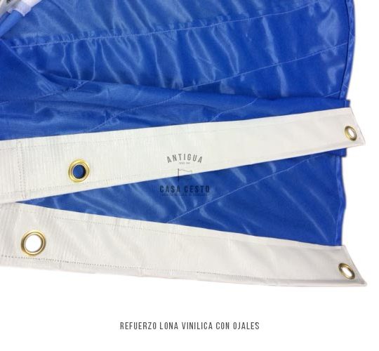 Adicionalmente pueden llevar esquinas reforzadas con tela y/o amarre en lona vinílica con ojales de bronce o mosquetones cromados. (Para banderas a partir de 4 mts de largo)